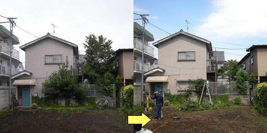 犬用ゲージに囲まれていたコンクリート敷を電動ハンマーでたたき、元の花壇の状態に戻しました。