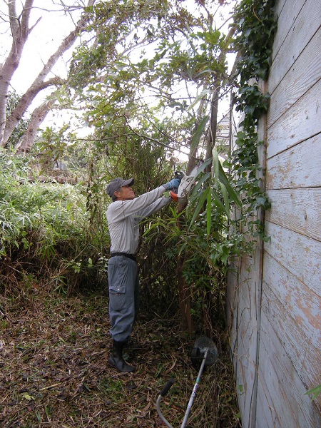 クマザサ刈取りと木伐採 敷地境界沿いに生えてしまったクマザサの刈取りと樹木の伐採を承りました。 境界塀設置をご計画でしたが、測量どころか、見積りさえできないほど生繁っておりました。 処分持込先が竹、シュロ、クマザサを受け入れないことがあり、地元の業者さんが逡巡されたようで、我々が作業いたしました。